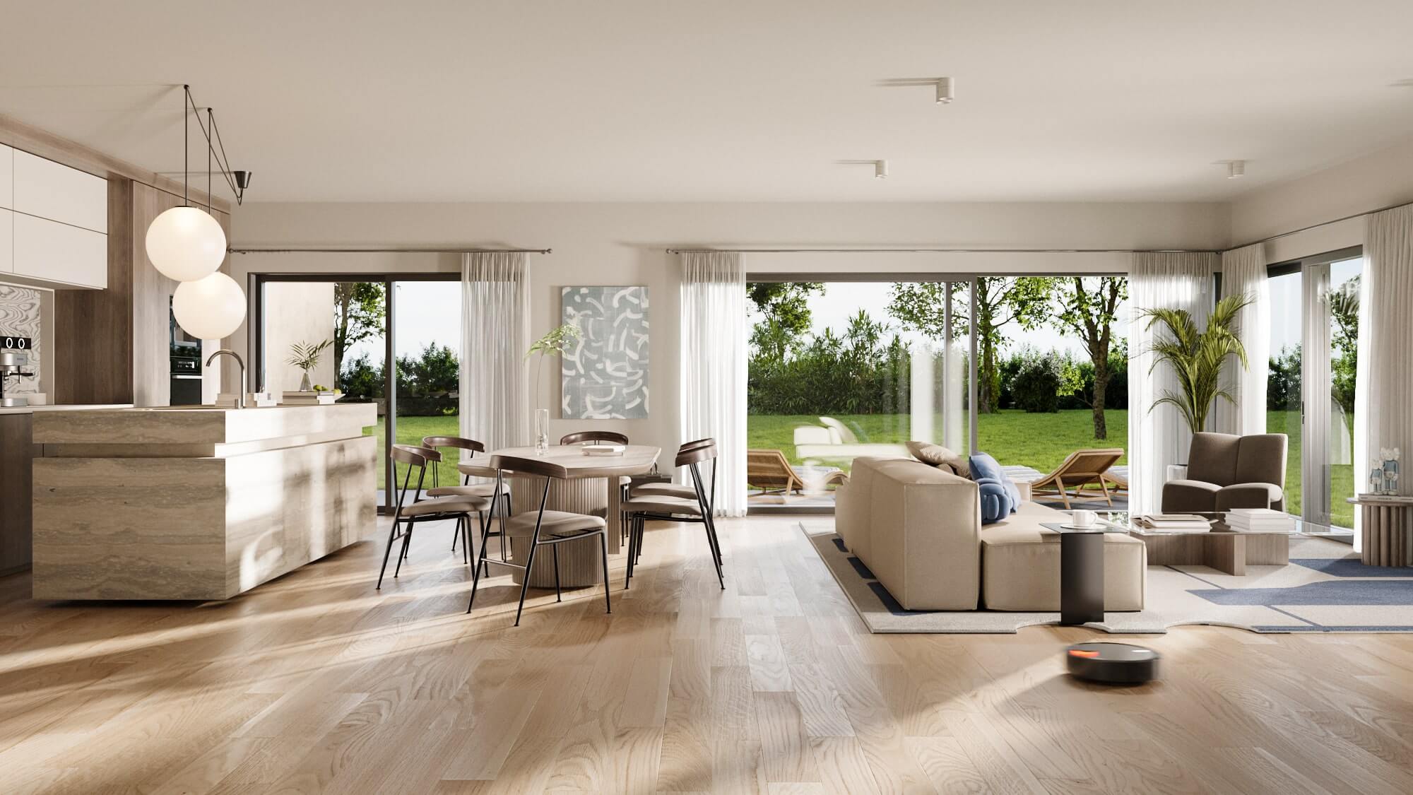 Les grands séjours lumineux sont prolongés par des terrasses ou des jardins. Les aménagements modernes et la qualité des finitions témoignent d’une attention particulière portée au bien-être et à la durabilité.